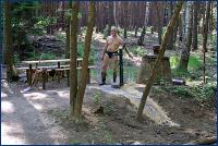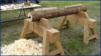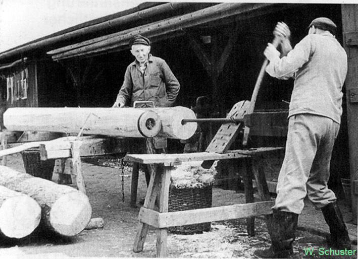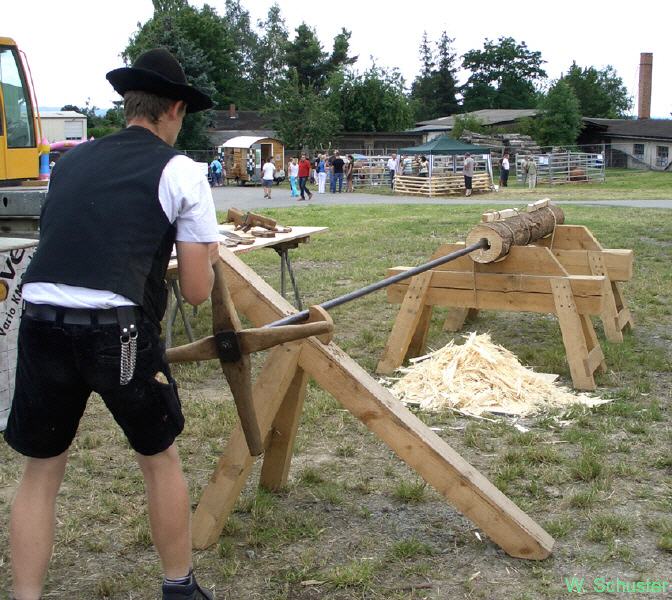 Die Fertigungstechnik und deren Abläufe zur Herstellung von Holzröhren auf altherkömmlicher Art zeigt auch die Firma Zimmerei Beyer aus Dittersdorf bei Schleiz auf Veranstaltungen, wie hier zum Beispiel beim Fest der Landwirtschaft am 10. Juli 2011.