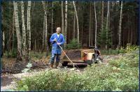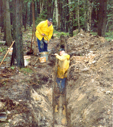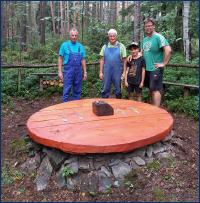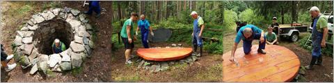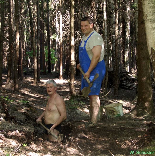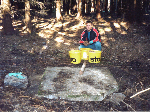 Der 1. Brunnen wurde im August 2004 rekonstruiert und Marco Schuster und Vater versiegeln mit einer Lehmmischung die Abdeckplatte, um ein Eindringen von Schmutz zu verhindern.