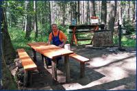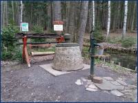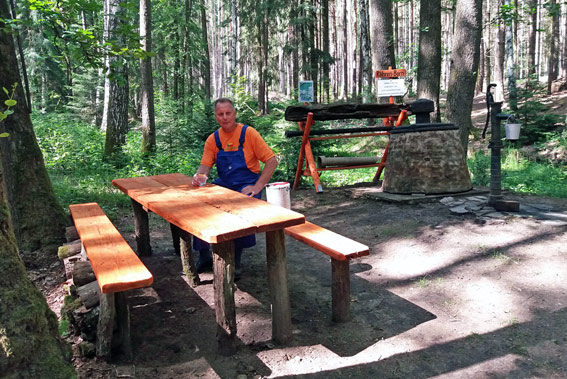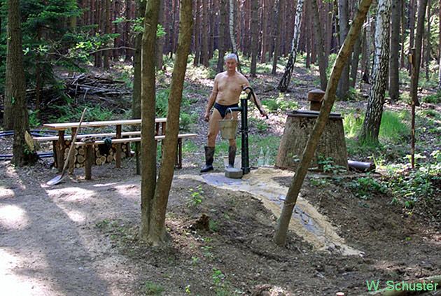 Nach getaner Arbeit an dem Rohrsystem kann sich Roland Wetzel nun am Hauptsammler mit kühlem Brunnenwasser erfrischen. In den vergangenen Tagen wurde hier eine Sitzgruppe errichtet und die Familie Wetzel sponsorte eine Handpumpe. Auch der nebenliegende Teich wurde abgedichtet und füllt sich wieder mit dem Wasser der "Roten Pöllnitz". Der Ort wird mehr und mehr eine zukünftige Oase der Erholung für Wanderfreunde.