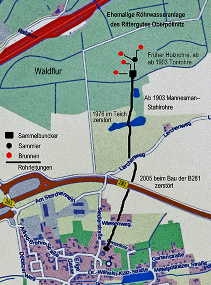Das Schloss und Rittergut wurde über Jahrhunderte über eine eigene Röhrwasseranlage mit dem erforderlichen Trinkwasser versorgt. Zu diesem Zweck hatte man 2 Brunnen gebaut, im Quellenbereich der "Roten Pöllnitz", im Rodabornwald nördlich des Dorfes. Deren Wasser führte man mittels Holzrohre in einen unterirdisch errichteten Hauptsammler und von hier wurde es zum ca. 1,5 km entfernten Rittergutshof geleitet. 1903 modernisierte und erweiterte man diese Anlage. Die Zuleitungen von den nun 4 Brunnen zum Hauptspeicher wurden mit Tonröhren ausgestattet und die Hauptleitung zum Rittergut mit teuren Mannesmann Stahlröhren. Durch die Erhöhung der Brunnenzahl war es nun möglich, die steigende Zahl der Tiere aller Art und die Bewohner auf dem Hof mit diesem Wasser zu versorgen. Notwendig war eine leistungsfähigere Wasserversorgung auch deshalb, da man 1901/02 auf dem Rittergut einen neuen, wesentlich größeren Kuhstall gebaut hatte und sich auch der Großviehbestand erhöhte. Die im Wald vorgefundenen alten Brunnen, nebst alten Holzrohrleitungen, bestätigen, dass schon vorher eine Wasserleitung existierte. Nach Aussage des Hans-Joachim Aster, Sohn des letzten RG-Besitzers, wurde die neue Stahlrohrleitung auf dem "Fundament" des alten Holzröhrensystems verlegt. Ob dieses damalige sogenannte "Röhrwasser" bis zum Rittergut führte, ist noch nicht geklärt aber sehr wahrscheinlich, denn schon 1537 wurde solch eine Röhrleitung beispielsweise zur Burg Posterstein geführt. Mit Hilfe von Holzröhren, die durch eiserne Buchsen miteinander verbunden waren, wurde das Wasser unterirdisch auf den Rittergutshof in sogenannte Röhrbottiche geleitet, die ebenfalls aus Holz bestanden und mit Hanf und Moos abgedichtet waren. Diese gleiche Bauart wurde auch hier in Oberpöllnitz angewandt. Das Reststück eines solchen Rohres befindet sich bei mir in Verwahrung. Die Holzrohre hatten einen Außendurchmesser von ca. 20 cm, die Buchsen von 8 cm. Mit einem langen eisernen Bohrer wurden die Stämme auf einem Röhrbohrstuhl bearbeitet. Die Länge des Bohrers bestimmte die Länge der entstehenden Röhren.