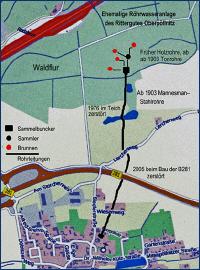 Bei der Rekonstruktion der vier Alten Brunnen wurden auch noch einzelne, früher verbaute Holzröhren gefunden. Teilstücke können noch vor Ort im Graben angesehen werden. Sie liegen im Wassergraben, um sie vor Verwitterung zu schützen. Nebenstehendes Bild zeigt die damalige Herstellung der Holzrohre. Deren Länge war durch die Länge der Bohrer vorgegeben. Verlängerungen, Abzweigungen oder auch Abwinklungen wurden durch am jeweiligen Ende eingeschlagene Eisenmuffen bewerkstelligt.