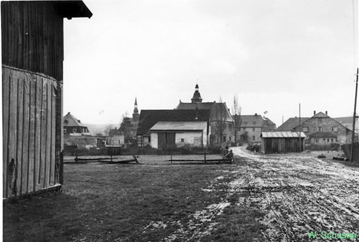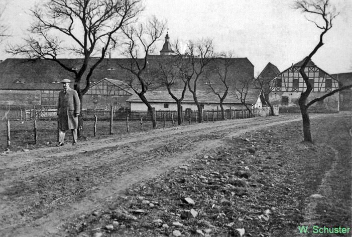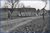 Die neu entstandene "Siedlerstraße" im Zustand 1957. Mit der Schaffung der Neubauernhöfe im Rittergutsbereich wurden einige Wirtschaftsgebäude abgerissen, auch um Baumaterial zu gewinnen. In den entstandenen Freiräumen verlegte man nun die Straße durch das Rittergutsgelände. Sehr oft waren bei gutem Ausgang der Anwohner erst einmal bis zum Dorf die Gummistiefel erforderlich! Links neben dem Hof Zuchold fehlt noch die 1956 abgebrannte Scheune vom Hof Petzold.
