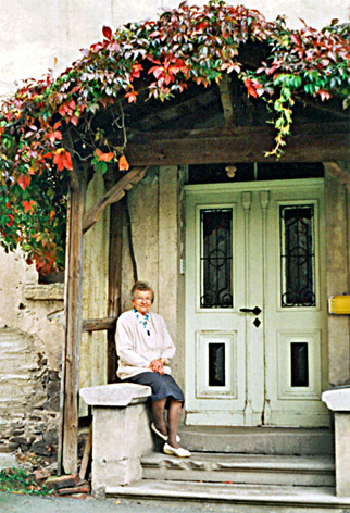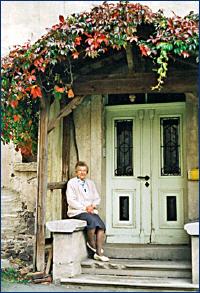 Frau Henni Geßner aus Mittelpöllnitz nimmt im Juli 2000 noch einmal ihren Stammplatz ein, auf dem sie als junge Frau gerne gesessen hatte. Sie wohnte einige Jahre im Pächterhaus und arbeitete bei ihrem Onkel u. Rittergutspächter Albert Abicht.