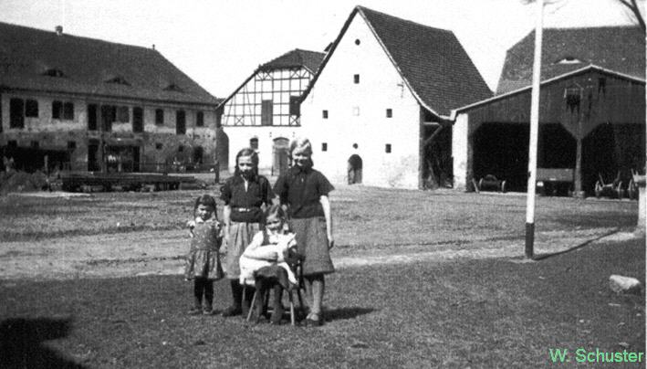 Die Hofseite nordwestlich gegenüber dem Eingangtor zu den Ställen hin. Groß im Bild das Kornhaus, links daneben der Kuhstall, 1902 erbaut und ganz links die Pferdeställe sowie das sogenannte "Butterhaus", in dem die Milch auch teilweise zu Butter und Käse verarbeitet wurde. Chefin war hier die Frau des RG-Pächters Abicht selbst. Die Kinder sind: Erika u. Edith Abicht, Hannelore Schuster mit Lamm und links Isolde Laitsch, Bild von 1943
