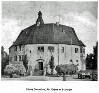 Das in Thüringen einmalige Rundschloss mit Blickrichtung auf die Westfront und dem Eingangsportal im Jahr 1928.