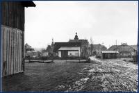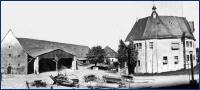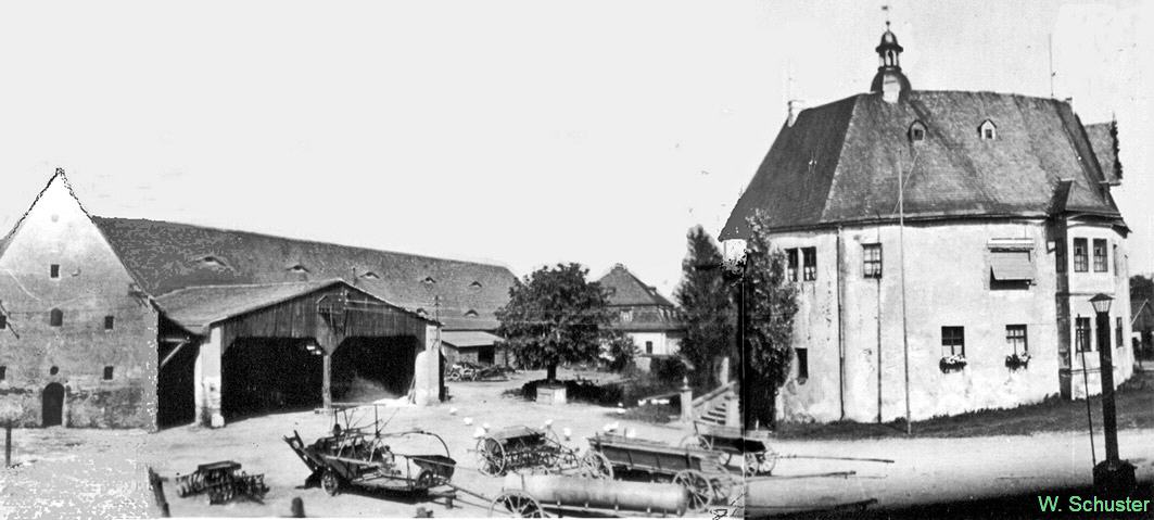 Die Hofansicht des RG 1939, östliche Blickrichtung. Kornhaus, große Scheune mit Wagenremise, Forsthaus. In der Bildmitte die Tiertränke mit dem teilweise noch erhaltenen Wassergraben. Die Wasserversorgung erfolgte mittels Röhrwasser aus dem nördlich gelegenen Waldgebiet. Siehe nachfolgende Unterseite: Die Wasserversorgung des Ritterguts