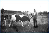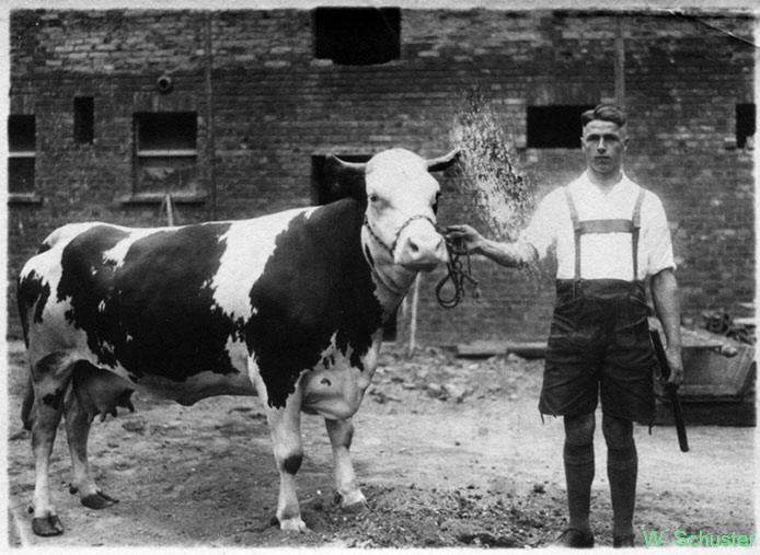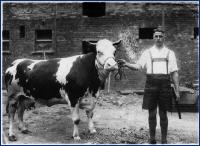 Obermelker Ulrich Schuster in seiner Allgäuer Anzugsordnung und mit der Simmentaler Leistungskuh "Gretel" 1936.