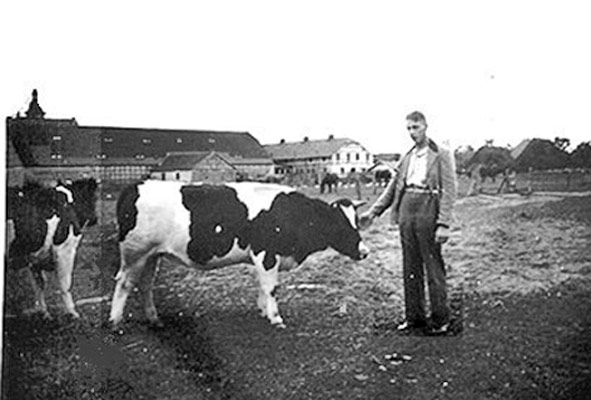 Nordansicht des Rittergutes 1938. Im Vordergrund Melkermeister Ulrich Schuster, Thüringer Landesmeister im Leistungsmelken 1938 u. 1940. Er kam 1933 von der Melkerschule Kempten auf das Rittergut Oberpöllnitz.