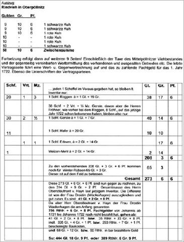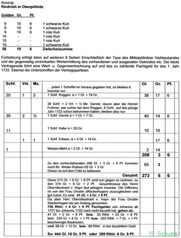 Es haben sich die Witwe Frau Anna Eleonora von Wackerhagen geb. Groß, auf Ober- u. Mittelpöllnitz und der Vormund der Verpächterin, Herr Amtsverwalter Friedrich Wilhelm von Schütz zum einen Teil und Herr Hans Carl von Hayn, königlich-polnischer und kurfürstlich-sächsischer, hochverehrter Oberstleutnant, Pächter zum anderen Teil, wegen den 756 Reichsthaler, 6 Groschen u. 8 Pfennig Pachtgeld geeinigt. Dieser Betrag wurde durch anschließenden Vergleich zum Pachtvertrag, am 21. Mai 1722 als Restsumme vereinbart und von der Gerichtsstelle am 23.07.1722 bestätigt, jedoch unter der Maßgabe, dass das vorhandene Vieh von besonders verpflichteten Metzgern noch taxiert werden muss. Darüber war man sich einig und gewann dafür die Taxatoren Meister Nicol Ruppe und Meister Johann Wilhelm Hager, beide Bürger und Fleischer aus Triptis.