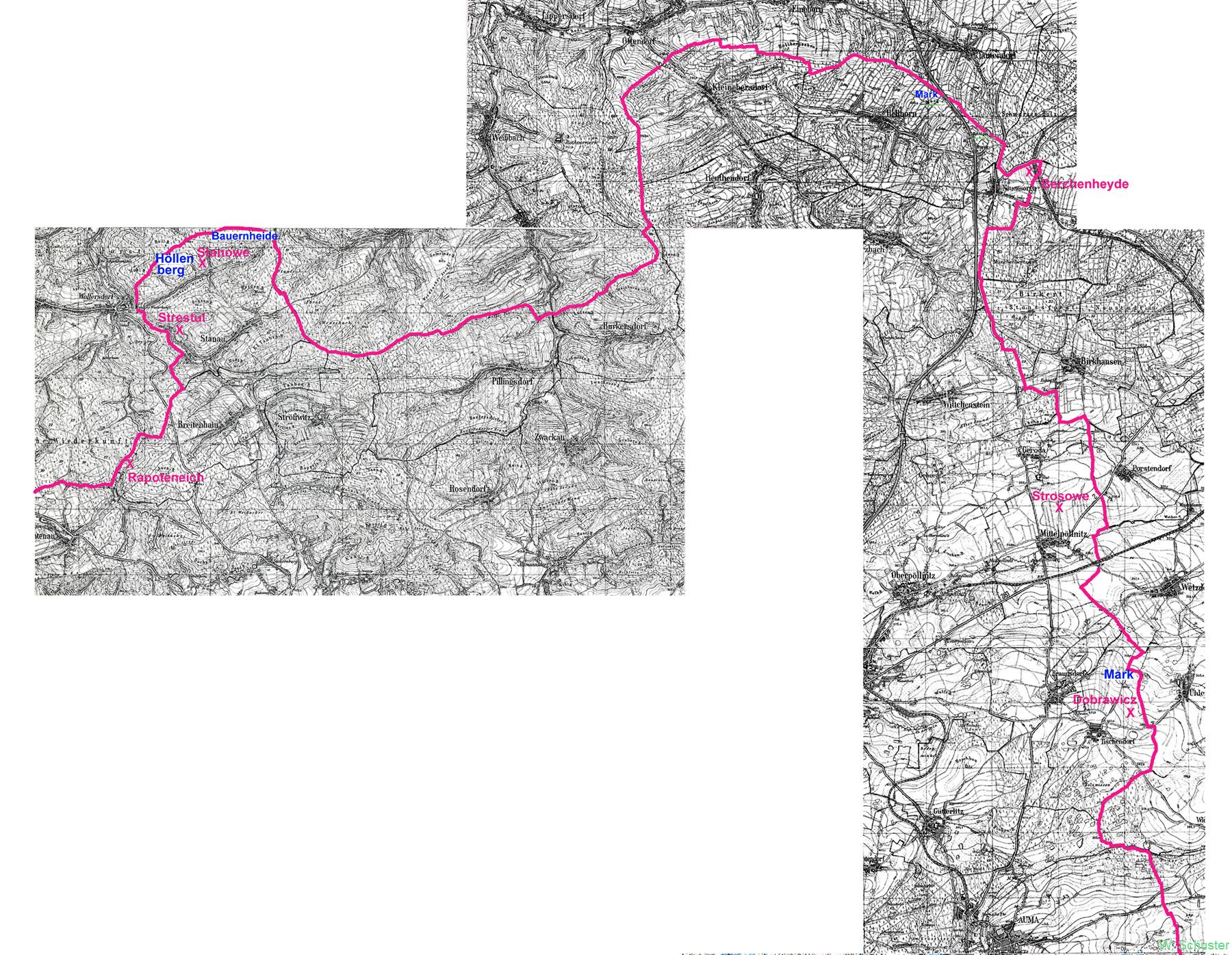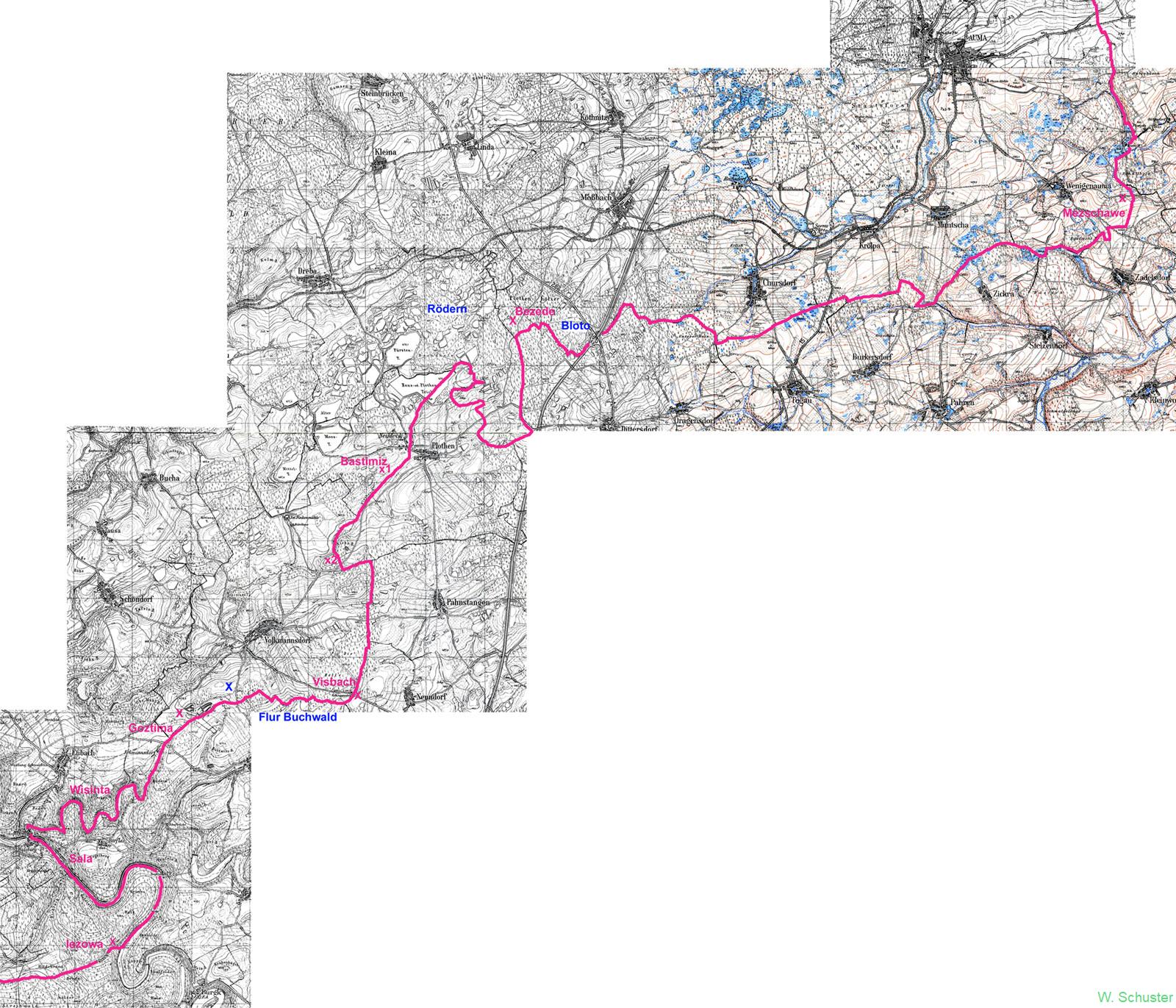 Der folgende Link zeigt eine topografische Kartenmontage mit dem eingezeichneten Grenzverlauf entsprechend der jeweiligen Gemarkungsgrenzen. Auf Grund der WEB-Komprimierung allerdings nur auf großem Bildschirm gut darstellbar.