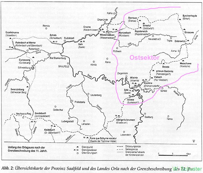 2) Vgl. Werner, Gerhard „Zur Grenzbeschreibung des Orlagaues aus dem 11. Jahrhundert“ und außerdem: Hengst, Karlheinz „Zur Frühgeschichte des Orla-Gaues aus sprachhistorischer Sicht“. Beide Beiträge in „Der Orlagau im Frühen und Hohen Mittelalter“, hrsg. von Peter Sachenbacher u. Hans Jürgen Beier, Langenweissbach 2007