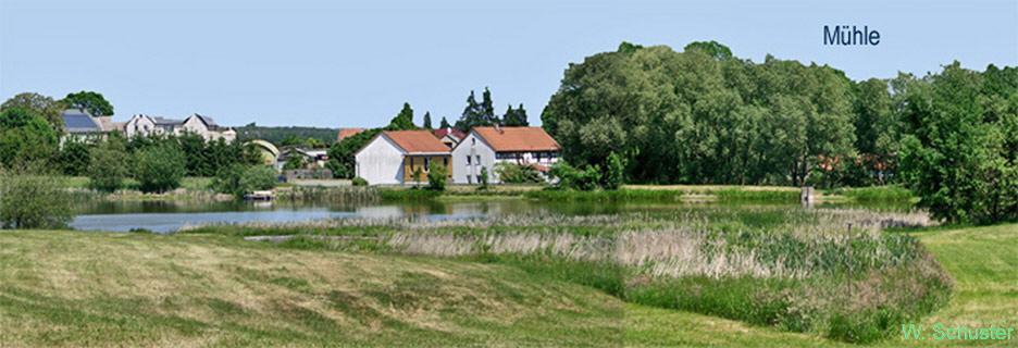 Die besprochene Mühle liegt im Bild rechts, hinter den Bäumen. Im Vordergrund ist nicht der Mühlteich zu sehen, sondern der von der ehemaligen LPG 1978 vergrößerte Lohteich für die Steigerung der Karpfenzucht. Der Mühlteich liegt zwischen Lohteich und Mühle.