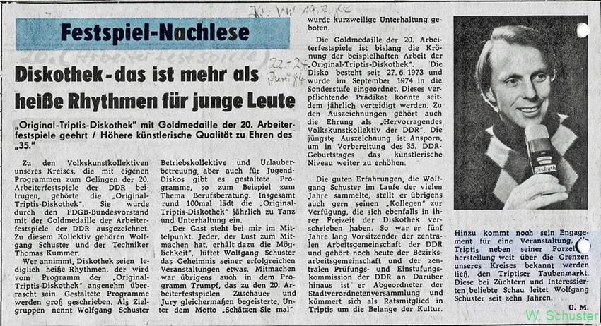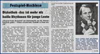 Zeitungsartikel über den gelungenen Auftritt der Discothek "OTD" zu den 20. Arbeiterfestspielen am 22.-24. 06. 1984. Prämierung mit einer Goldmedaille.