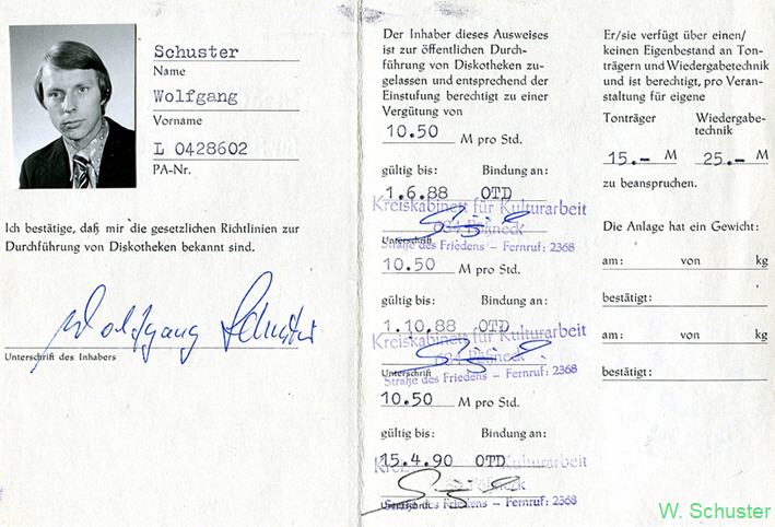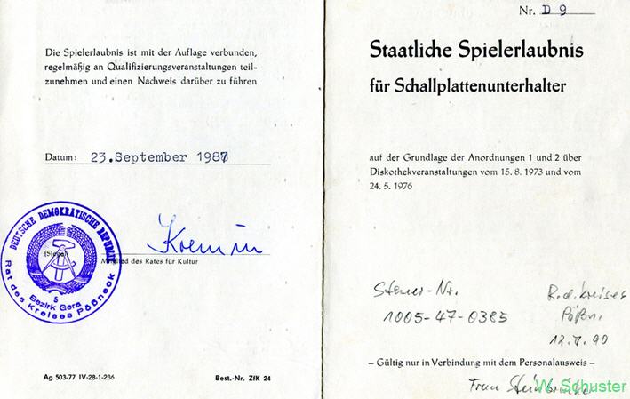 So sah eine Staatliche Spielerlaubnis aus mit der ein DJ berechtigt war aufzutreten und dafür Honorar abzuverlangen.