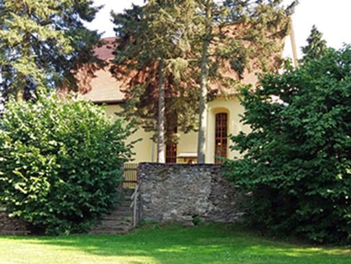 Die Kirche von der Nordseite mit dem Treppenaufgang vom Schlossgarten zur Kirche. Früher gab es noch einen gesonderten Zugang zu den 2 Patronatsständen der Patronatsherren von Oberpöllnitz und Geroda über einen nordseitigen Anbau.