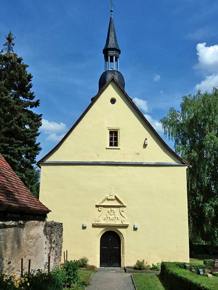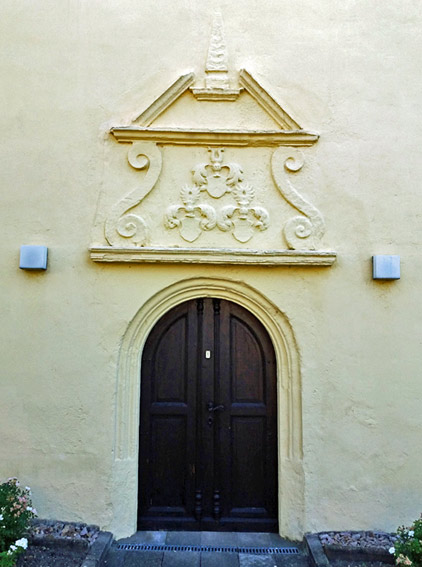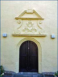 Die Westseite der Kirche mit Eingangstür und Wappenaufsatz.