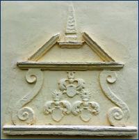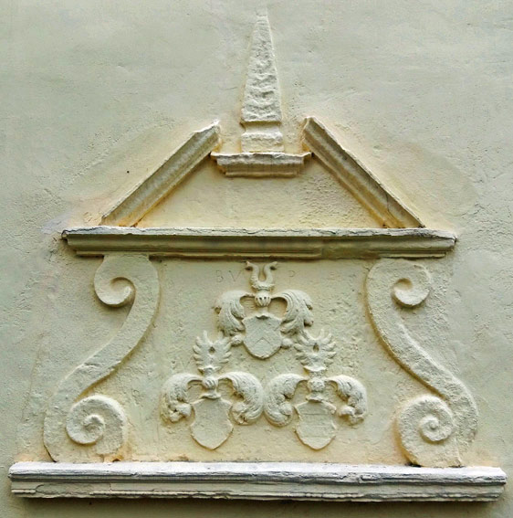 Die Darstellungen im Wappenaufsatz sind zwar sehr verwittert, doch kann man mit etwas Mühe noch die Initialen erkennen. Der Wappenaufsatz enthält demzufolge das hier dargestellte Wappenkonvolut.