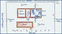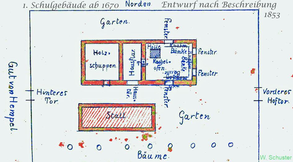 Die "Alte Schule" 1850 im Grundriss gezeichnet von einem alten Mann nach seinen Kinds-Erinnerungen. Im Vergleich zur vorhergehenden Beschreibung aus dem Jahr 1735 aber wahrscheinlich schon weiter "modernisiert". Es ist in heutiger Zeit kaum noch zu verstehen, wie es möglich war, dass 1 Lehrer z.B. 1850 ca. 80 Kinder unterrichten konnte. Weshalb ja dann 1853 ein neues Schulhaus errichtet wurde. Grundriss entnommen aus der Schulchronik von 1923.