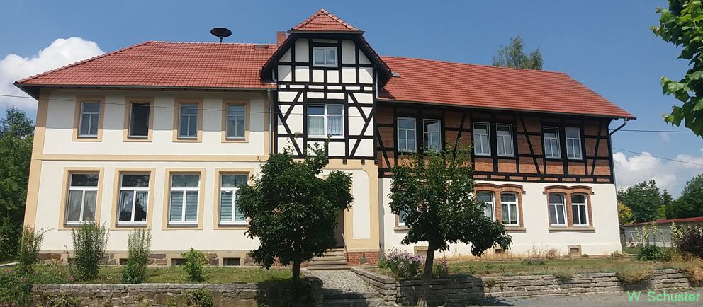 Das ehemalige Schulhaus in Oberpöllnitz. Rechtsseitig das 1853 erbaute neue Schulhaus und links der 1907 erfolgte Erweiterungsbau. Linker Hand gab es noch einen Schulgarten, der Hof wurde für Pausen und Sport genutzt und hinter dem Altgebäude gab es noch die Toilettenanlagen. Mit dem Erweiterungsbau entstanden ebenfalls insgesamt 3 Lehrerwohnungen.