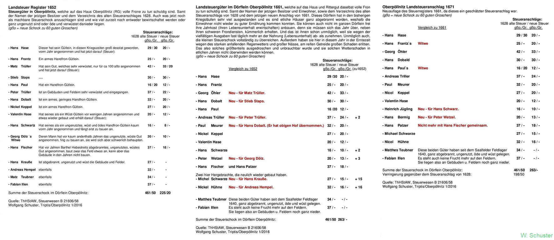 Sie sehen hier eine Zusammenfassung der Steueranschläge 1652/1661/1671 als JPG-Bild und in PDF-Format. Für den interessierten Leser besteht der Vorteil darin, die Entwicklungsschritte der Untertanen besser vergleichen zu können.