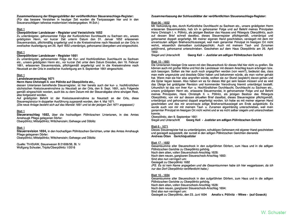 Die veröffentlichten 5 Steueranschläge der adligen Herrschaft Oberpöllnitz beginnen in der jeweiligen Akte mit einem Eingangsblatt und enden mit einem Schlussblatt. Diese Texte habe ich aus Platzgründen in einem JPG-Bild zusammengefasst und stelle sie auch als PDF-Datei zur Verfügung.
